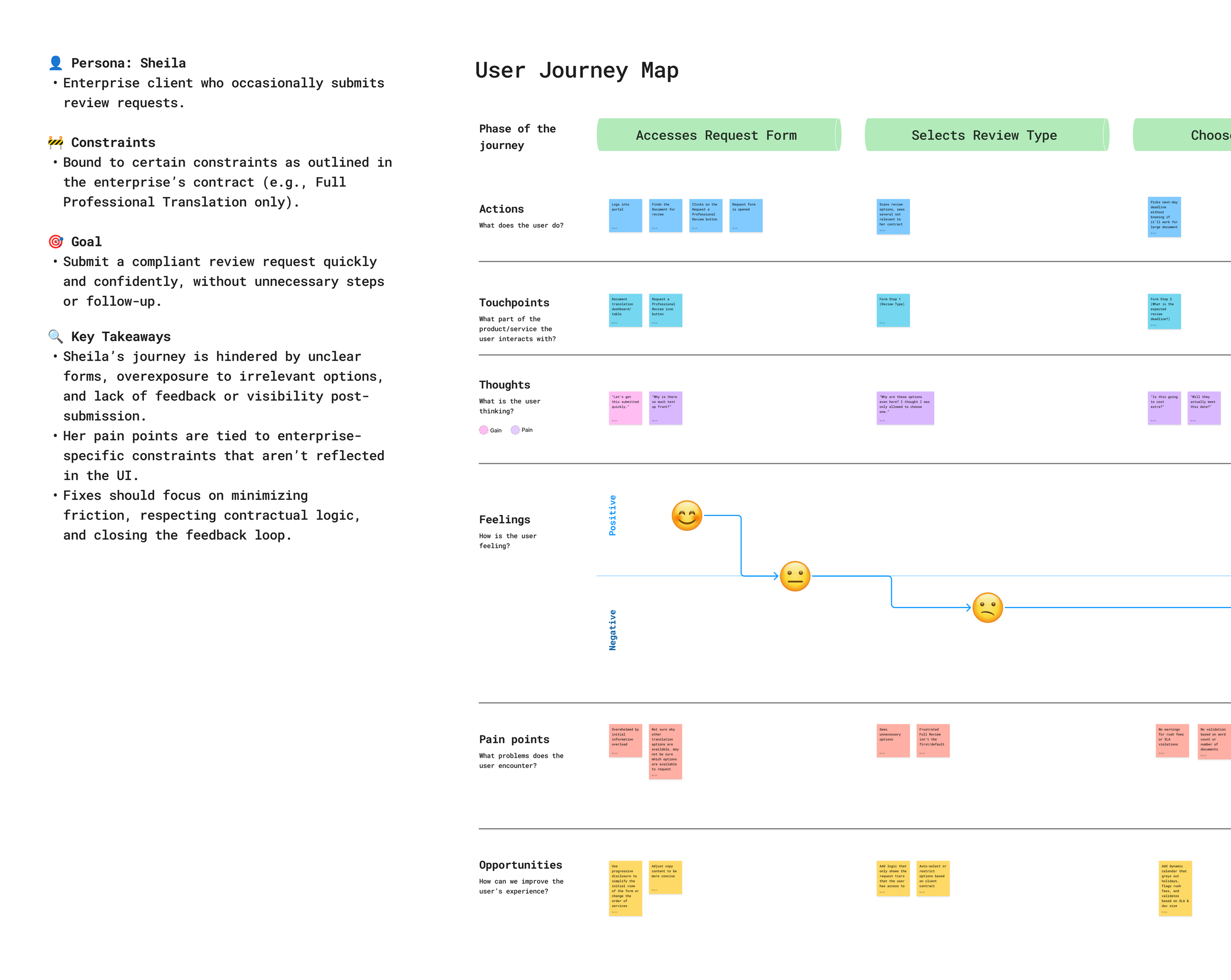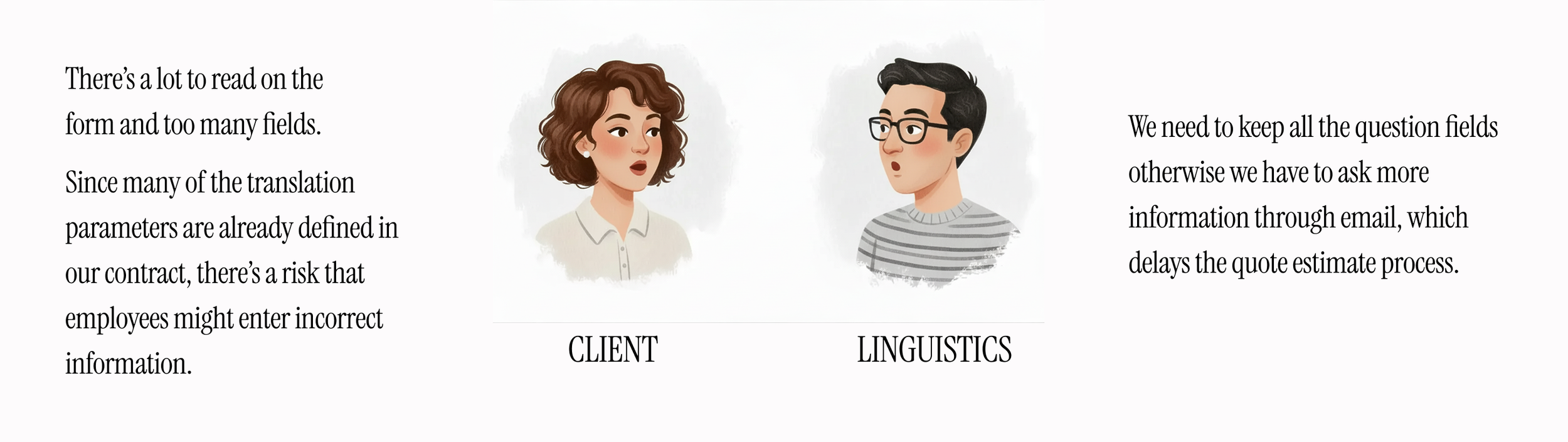 I noticed a gap — there was little to no input from the clients (the requestors) who actually submitted reviews. This imbalance risked creating a workflow that optimized for linguists but introduced friction for clients.