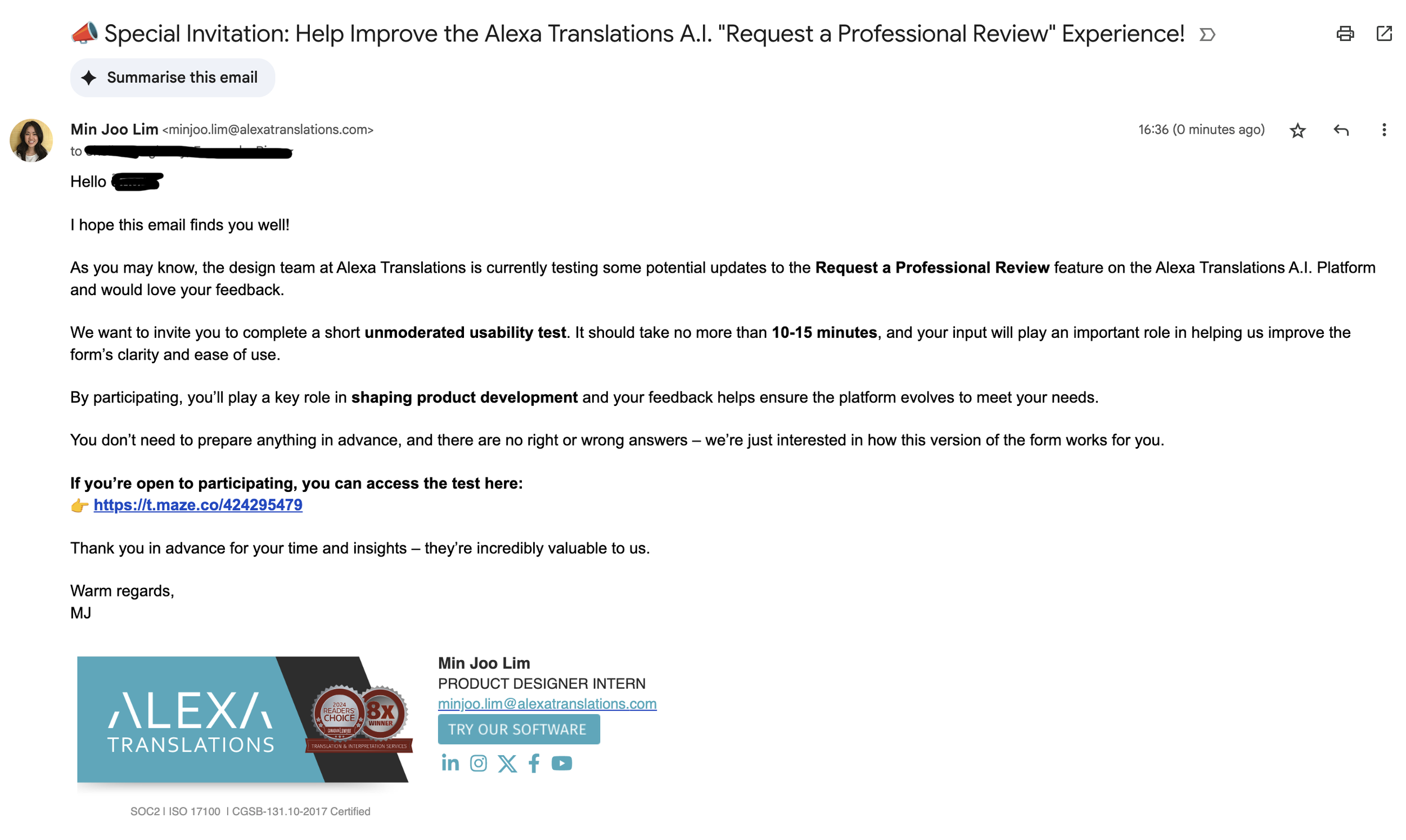 🧭 Context → As a Product Designer Intern, I led research, ideation, and usability testing for a redesign of the Request a Professional Review feature in the Alexa Translations AI platform.