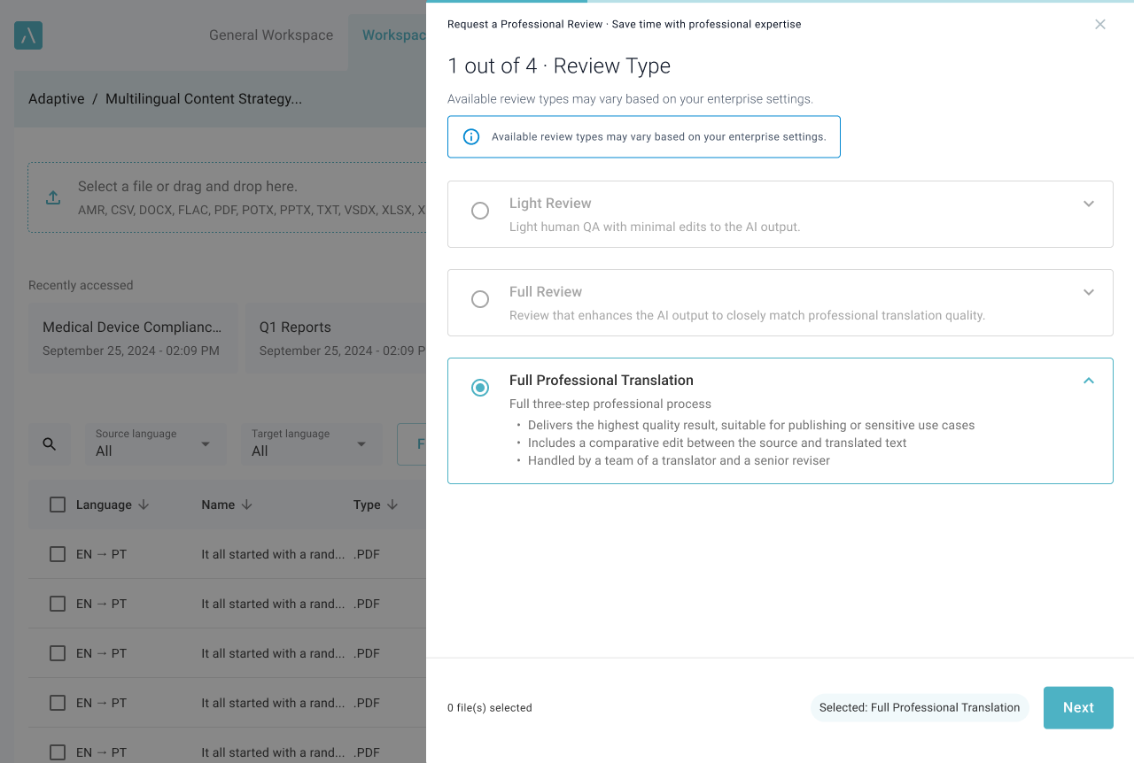 This balance is what the Request a Professional Review service offers: giving clients the option to combine the speed of AI translation with the assurance of expert human oversight.