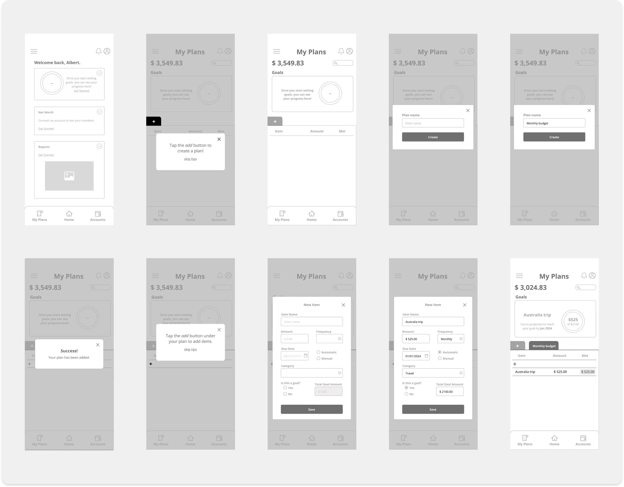 The Home Dashboard and My Plans pages, in particular, underwent extensive iterations based on user and peer feedback. For example, the flow of “adding a goal” was changed from a single forms page to multiple slides. The initial form design seemed lengthy so it was redesigned to avoid deterring users.