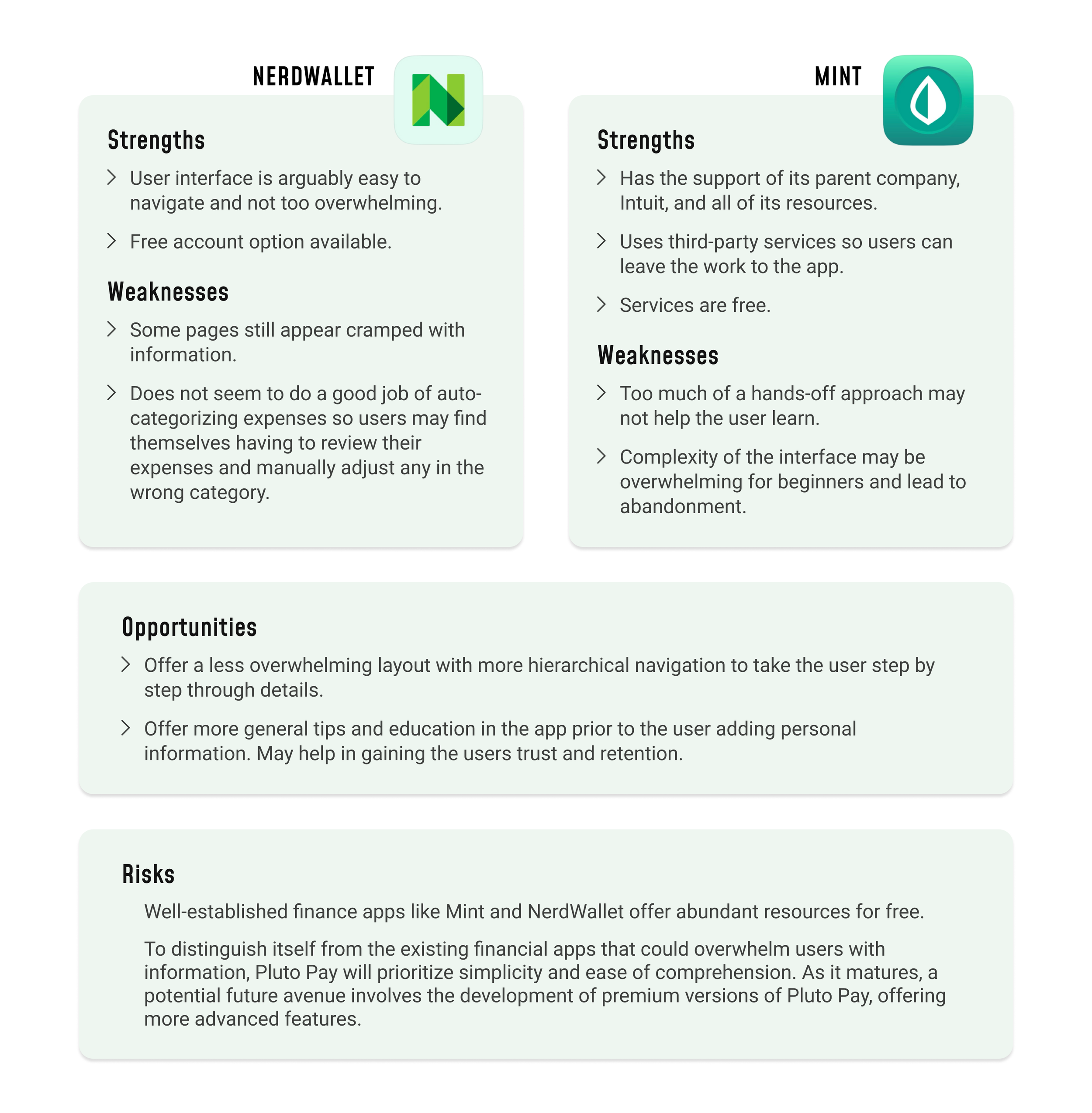 I deep dived into two widely used money management applications, Mint and NerdWallet, to identify opportunity areas that could be filled with Pluto Pay.