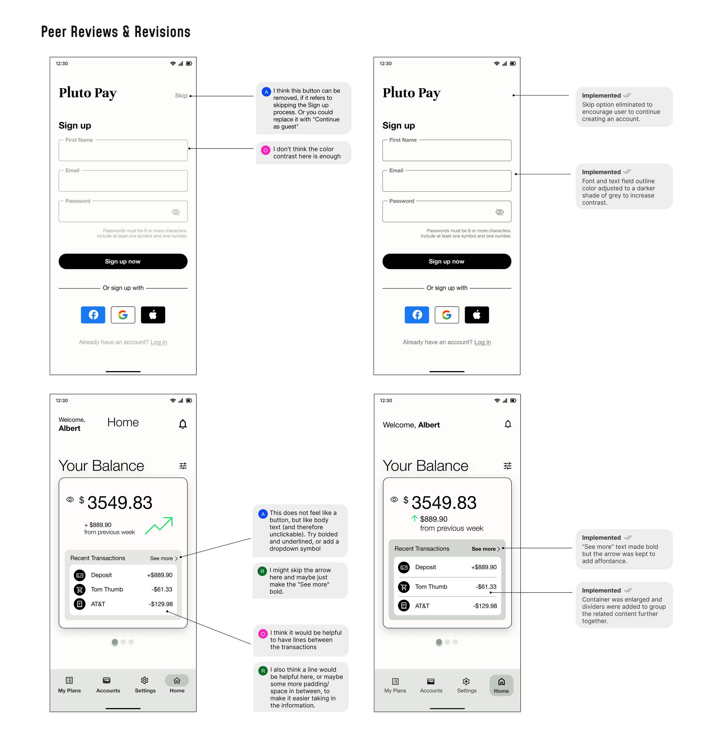 Next, I revisited and revised designs requiring improvement in terms of accessibility, addressing elements such as acceptable color contrast, font size, and adding supplementary labels for enhanced user experience.