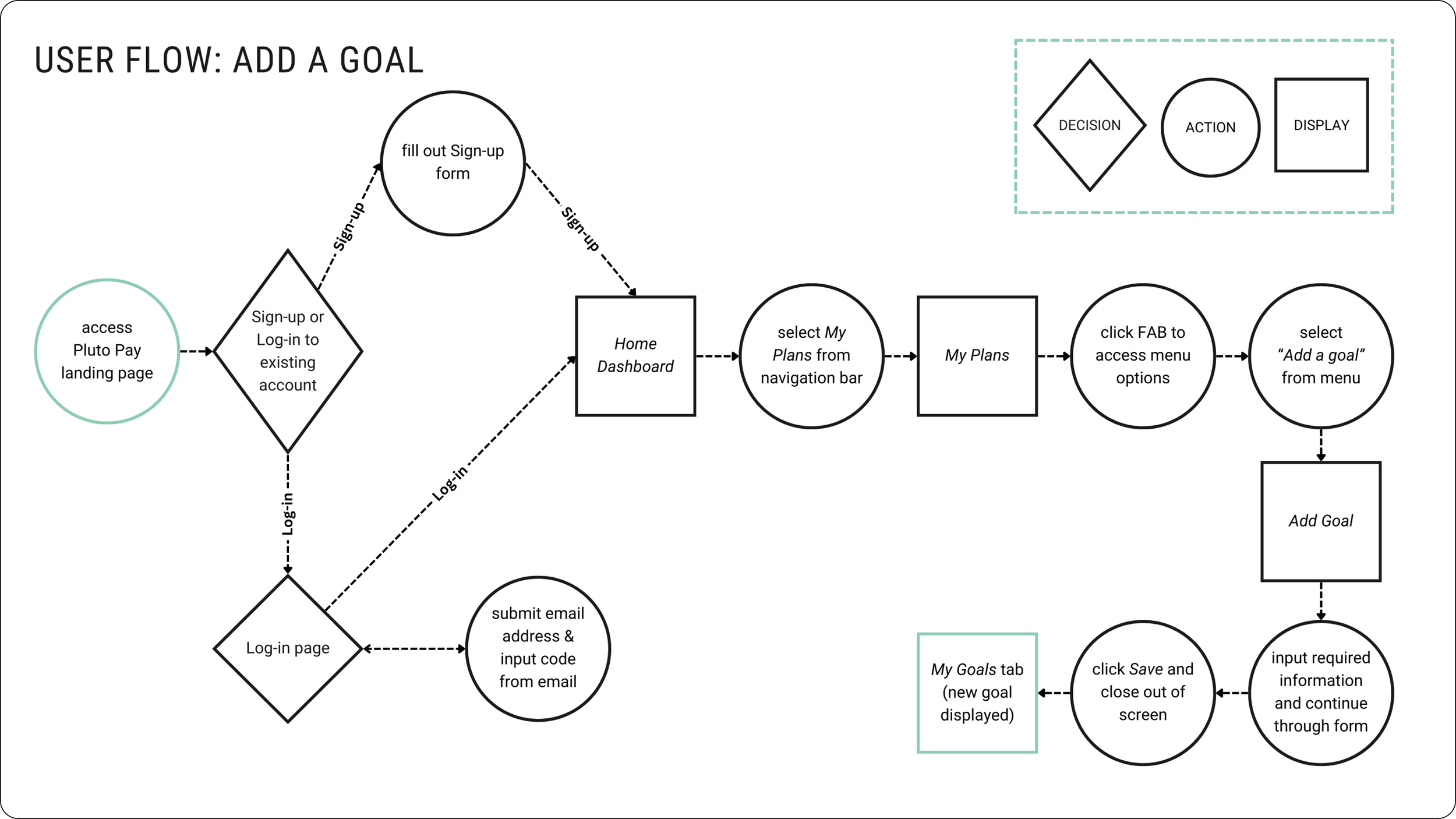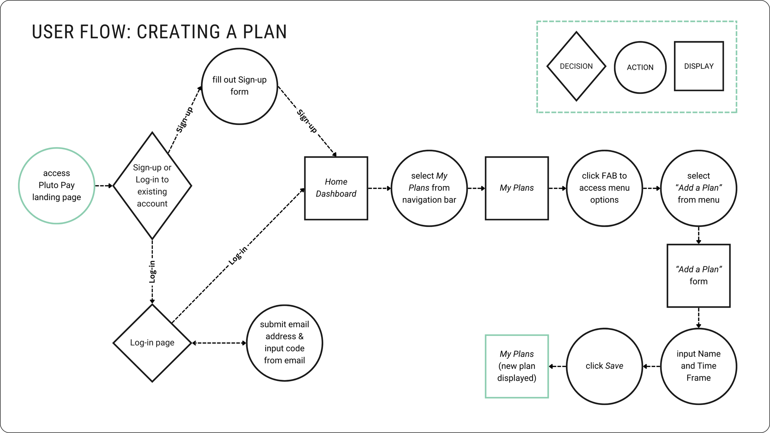 With the key features outlined, I created user flows for primary tasks to start illustrating the information architecture of Pluto Pay and to address potential areas of user frustration or roadblocks while performing these tasks.